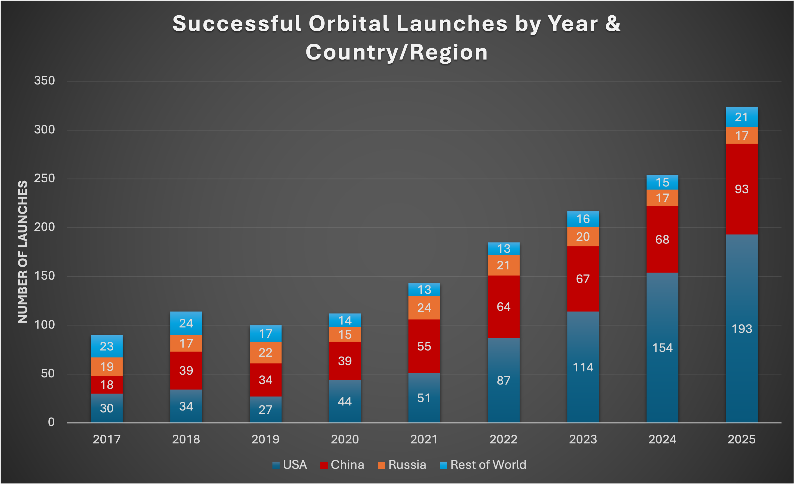 At the same, launch cadence is accelerating dramatically — and has been doing so for the last 5 years (see Figure 2). SpaceX alone flew over 130 orbital missions in 2025, while global launch activity topped 320 successful missions — nearly triple the annual rate from five years ago. Launch is no longer a constraint. It's routine infrastructure.